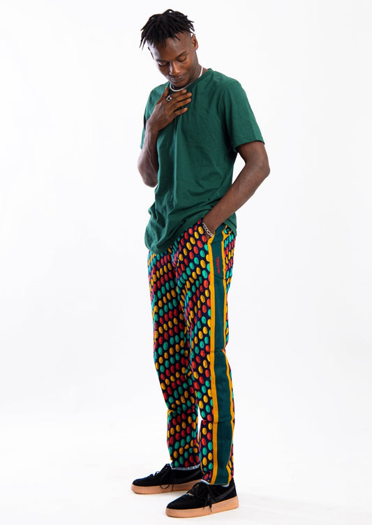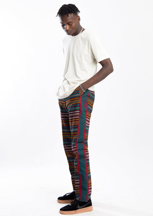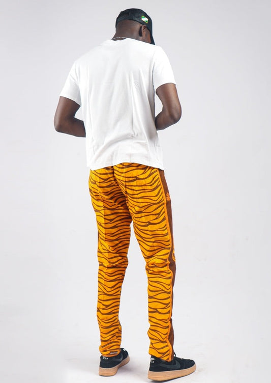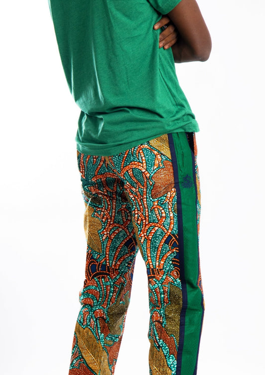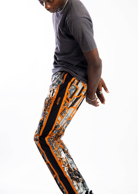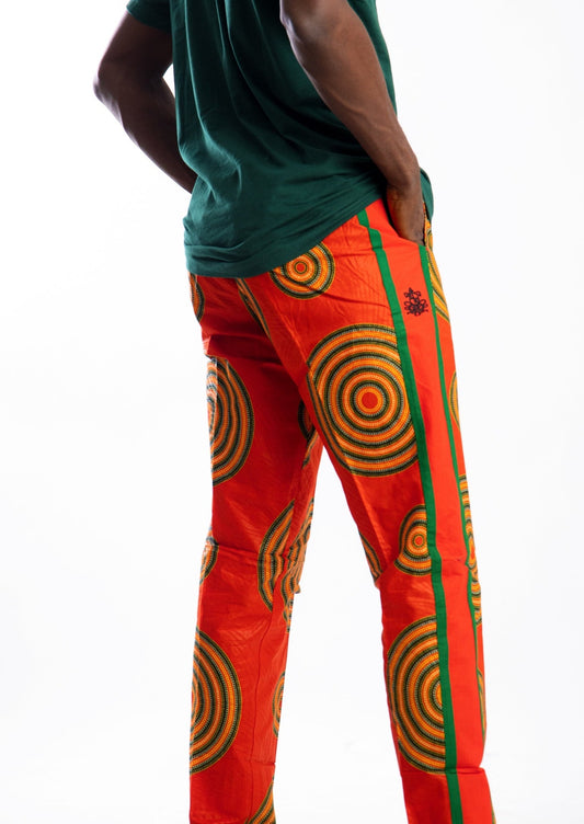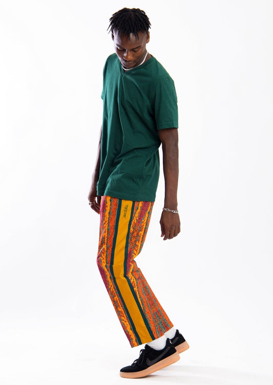 Orange worm print pants with green contrast strip
